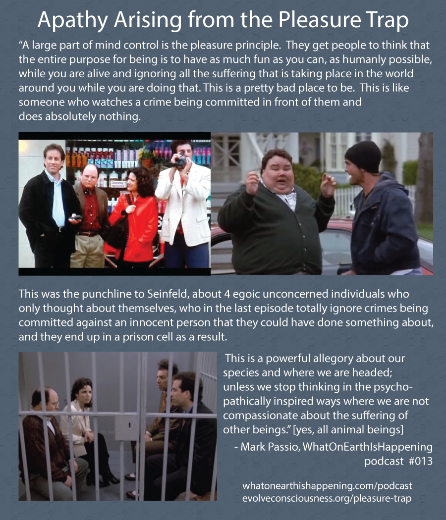 “A large part of mind control is the pleasure principle. They get people to think that the entire purpose for being is to have as much fun as you can, as humanly possible, while you are alive and ignoring all the suffering that is taking place in the world around you while you are doing that. This is a pretty bad place to be. This is like someone who watches a crime being committed in front of them and does absolutely nothing.