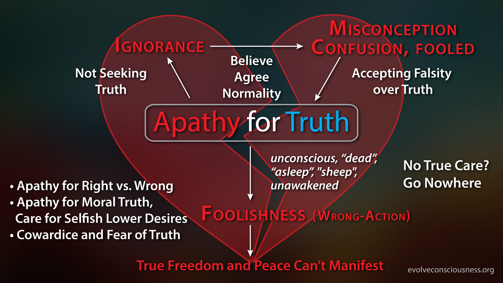 Overall, apathy for truth is to be and remain “unconscious”, “dead”, “asleep”, “sheep”, unawakened and uninitiated. We are “dead” in the coffin or tomb, unconscious to Moral Truth and it’s importance in life, unawakened, asleep. We lack care, not living in greater Care for Moral Truth, so it symbolizes a “deadened” “heart” center, a “deadened” core, “essence”, “spirit” and consciousness.