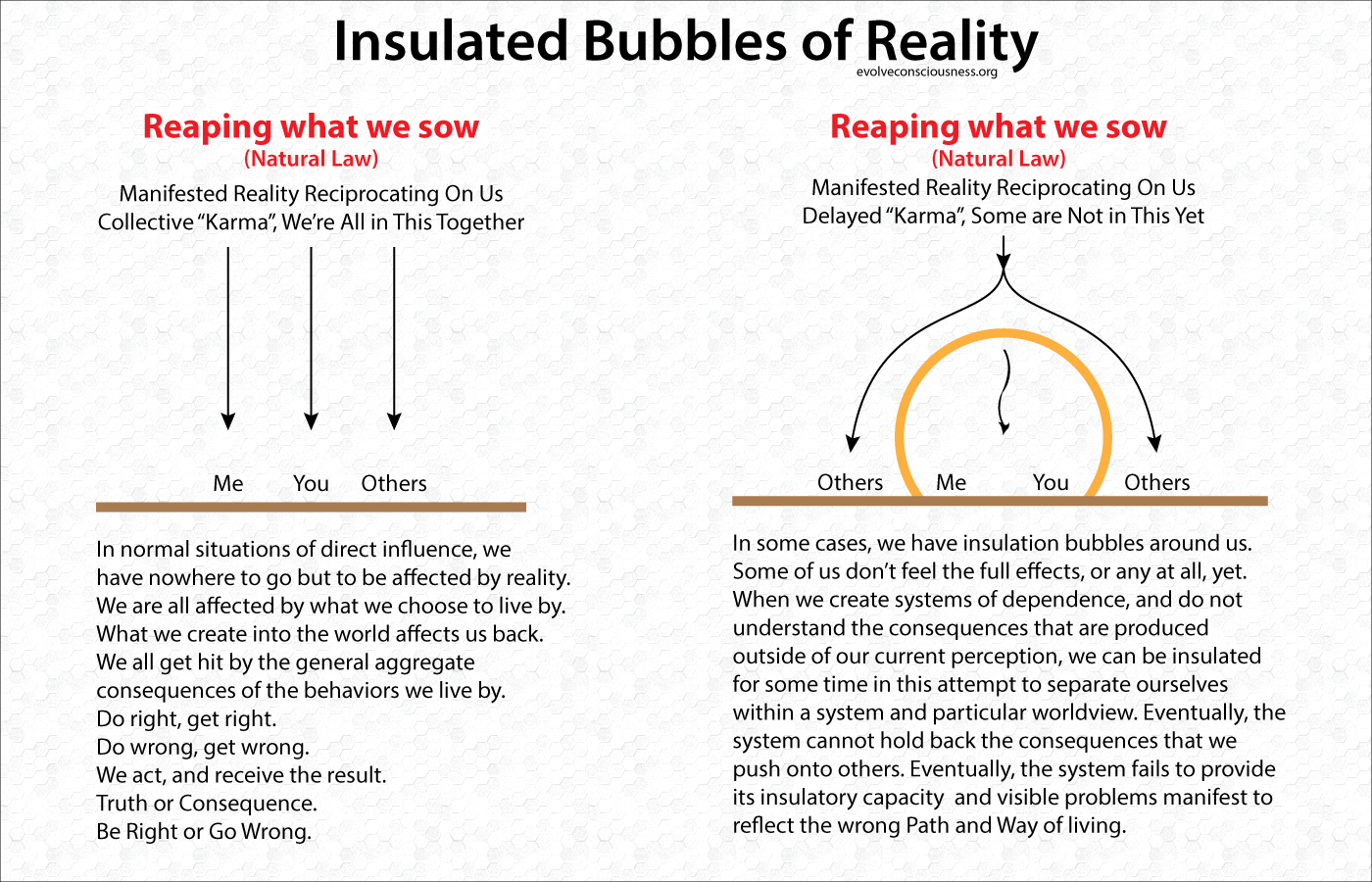 In some cases, we have insulation bubbles around us. Some of us don’t feel the full effects, or any at all, yet. When we create systems of dependence, and do not understand the consequences that are produced outside of our current perception, we can be insulated for some time in this attempt to separate ourselves within a system and particular worldview. Eventually, the system cannot hold back the consequences that we push onto others. Eventually, the system fails to provide its insulatory capacity and visible problems manifest to reflect the wrong Path and Way of living.