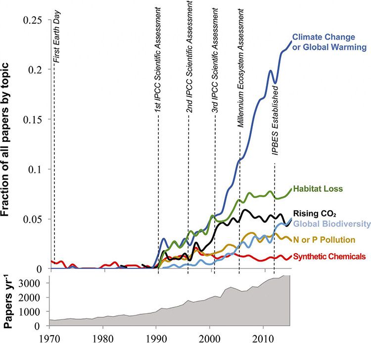 Look at that chart above, there is a crazy difference in the amount of papers about Climate Change compared to synthetic chemicals.