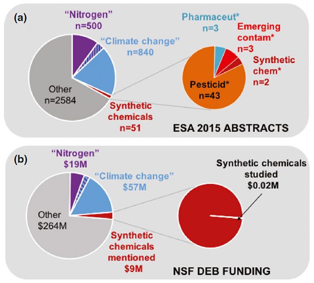 The study looked at synthetic chemical pollution since the 1970s and compared the results to other factors that drive global change. Out of all the leading ecological journals, ecological meetings and presentations, and Natural Science Foundation grants for research, less than 1% of journal articles, 1.3% of presentations and 0.01% of grants have been used to explore the ecological effect of these chemicals.