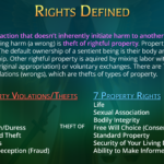 A right is an action that doesn’t inherently initiate harm to another sentient being. Initiating harm (a wrong) is theft of rightful property. Property is based in ownership. The default ownership of a sentient being is their body and their will: self-ownership. Other rightful property is acquired by mixing labor with natural resources (original appropriation) or voluntary exchanges. There are 7 primary property violations (wrongs), which are thefts of types of property.