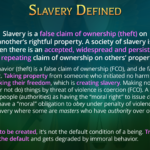 Slavery is a false claim of ownership (theft) on another’s rightful property. A society of slavery is when there is an accepted, widespread and persistent or repeating claim of ownership on others’ property.