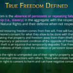 True Freedom is the absence of persistent or repeating false claims of ownership (i.e., slavery) in the aggregate; with the respect of everyone’s Natural Rights and their defense when not respected.