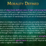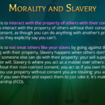 Immoral behavior (theft) is a false claim of ownership (FCO), and de facto enslavement. Taking property from someone who initiated no harm (non-violent) is taking their freedom, which is creating slavery. Making non-violent people do (or not do) things by threat of violence is coercion (FCO). A society that views some people (authorities) as having the “moral right” to issue commands that others have a “moral” obligation to obey under penalty of violence (FCO), is a society of slavery where some are masters who have authority over others who are slaves.