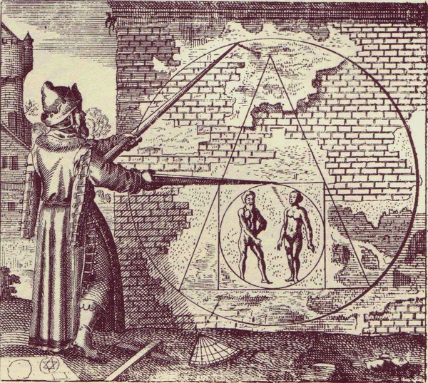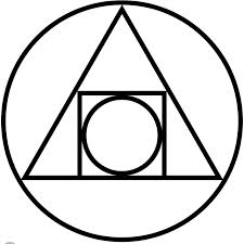 “The appearance is expressed geometrically in Michael Maier‘s Atalanta Fugiens. “Make of a man and woman a circle; then a quadrangle; out of this a triangle; make again a circle, and you will have the Stone of the Wise. Thus is made the stone, which thou canst not discover, unless you, through diligence, learn to understand this geometrical teaching.”
