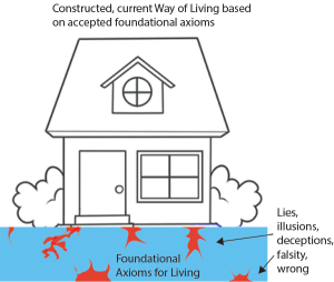 condition. Accepting falsehoods in the place of truth is like building a flawed and faulty foundation for a house. Everything we build is based upon the foundation. Building upon a foundation of falsehoods, deceptions and lies as a result of failure to align and harmonize with truth will create a week and feeble house. It is a house built upon untruth and will require constant Band-Aids in attempts to keep the poor construction standing. The more we build on top of falsehoods, the more we diverge from an accurate understanding. Focusing on temporarily patching-up symptoms and effects without understanding the root causal factors is a failure to understand foundational core principles recognized through alignment with Truth, reality, what ‘is’.