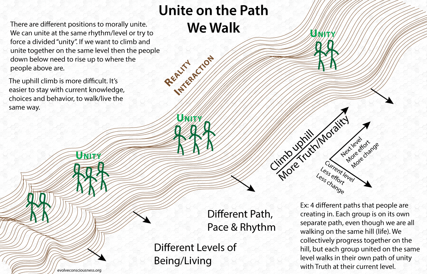 Ex: 4 different paths that people are creating in. Each group is on its own separate path, even though we are all walking on the same hill (life). We collectively progress together on the hill, but each group united on the same level walks in their own path of unity with Truth at their current level.